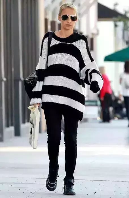 黑白条纹蝙蝠袖宽松套头毛衣+黑色修身长裤+黑色系带运动鞋+黑色单肩包+黑色墨镜