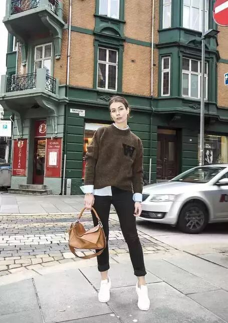 褐色针织毛衣+蓝色衬衫+黑色九分裤+白色运动鞋+咖色手提包