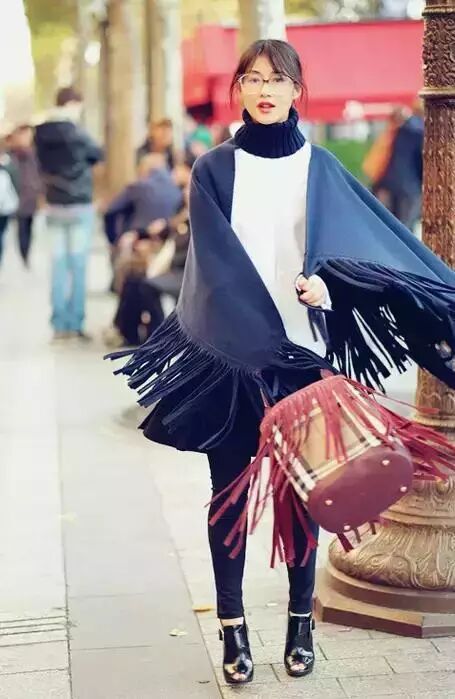 白色高领毛衣+黑色铅笔裤+黑色鱼嘴高跟靴+红色流苏水桶包+蓝色流苏披肩围巾