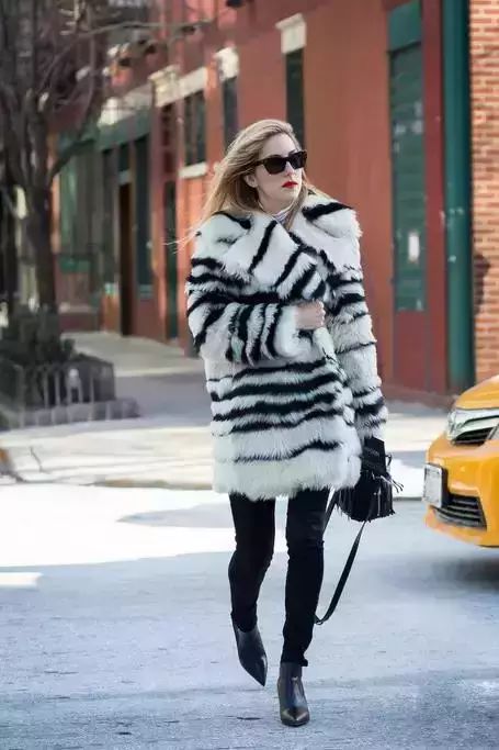 黑白条纹毛毛大衣+白色高领衫+黑色铅笔裤+黑色尖头高跟靴+黑色流苏手提包