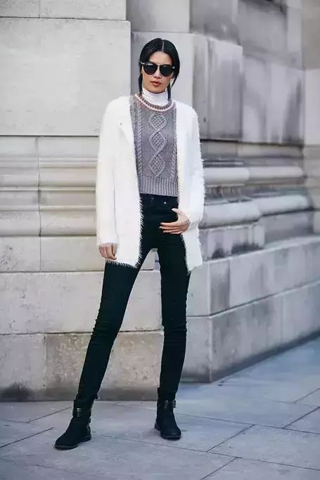 搭配宽松毛衣,“上宽下窄”营造出视觉上显瘦的效果
