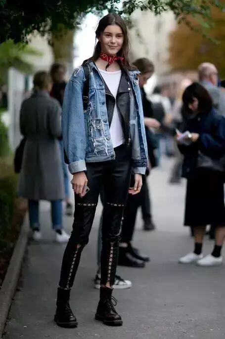 蓝色破洞牛仔外套+黑色机车皮衣+白色圆领T恤+黑色镂空打底裤+黑色马丁靴