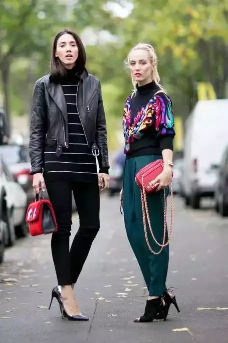 黑色机车皮衣夹克+黑色高领条纹针织衫+黑色紧身裤+黑色尖头高跟鞋+红色眼睛手提包