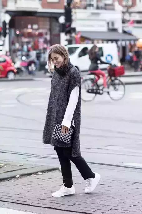 深灰色高领长款针织马甲,白色宽松衬衫+黑色休闲直筒裤+白色复古运动鞋+拼色格子手拿包