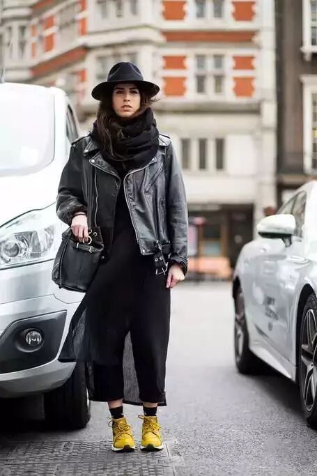 黑色机车夹克+黑色雪纺连衣裙+黑色九分哈伦裤+黄色运动跑鞋+黑色简约单肩包